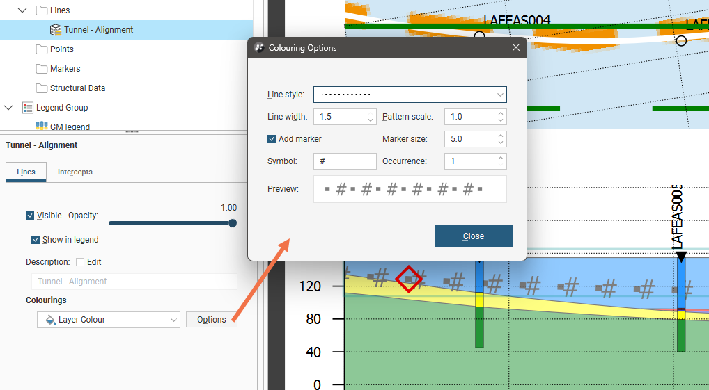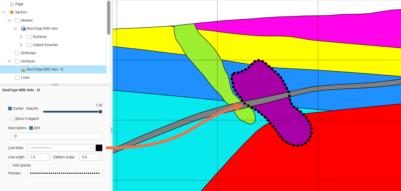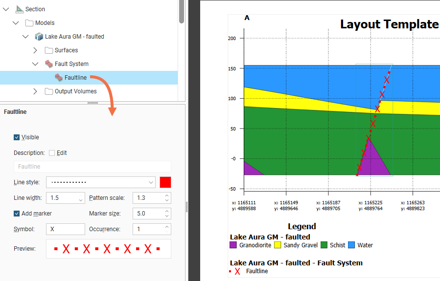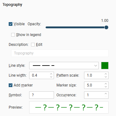 In the layout tree, click on the line object to view line styling options. Visibility can be turned on or off and the Opacity of the projection of the line onto the section can be set. Edit the text used to display the line by enabling the Edit box and then changing the text. You can change the Line style, Line width, Pattern scale and colour. You can also define a marker to display along the line by enabling Add marker and then specifying a Symbol to use. Increasing the Occurrence number increases the gap between symbols. A Preview is displayed and the surface will be updated in the section preview.