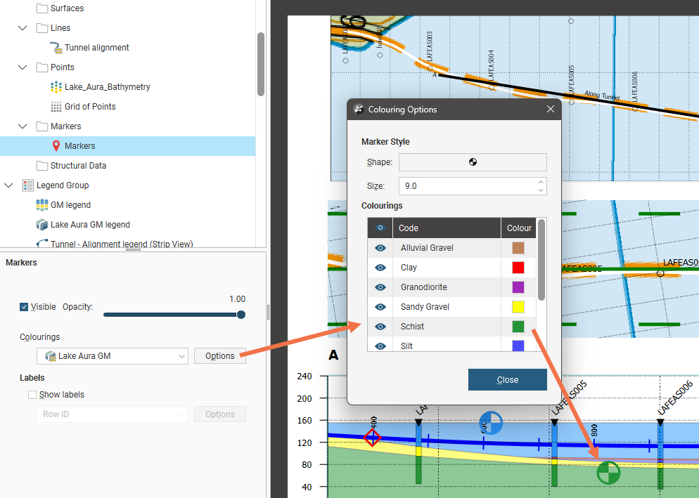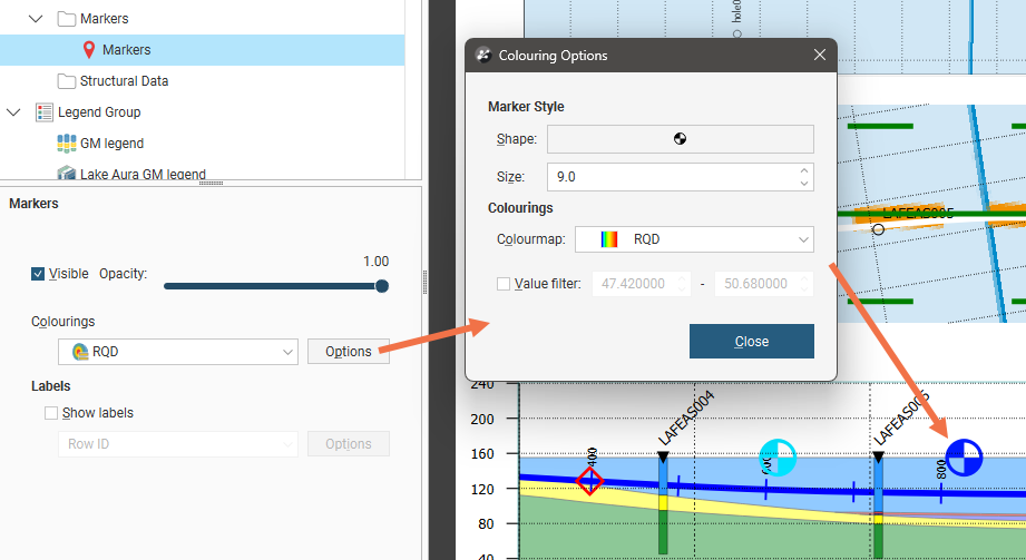 If you choose a numeric value column associated with the markers and click Options you can pick a Shape from 60 symbols and set the Size of the markers on the section. You may also be able to select from available Colourmaps if more than one is available, and enable a Value filter to only show points between a specified minimum and maximum value.