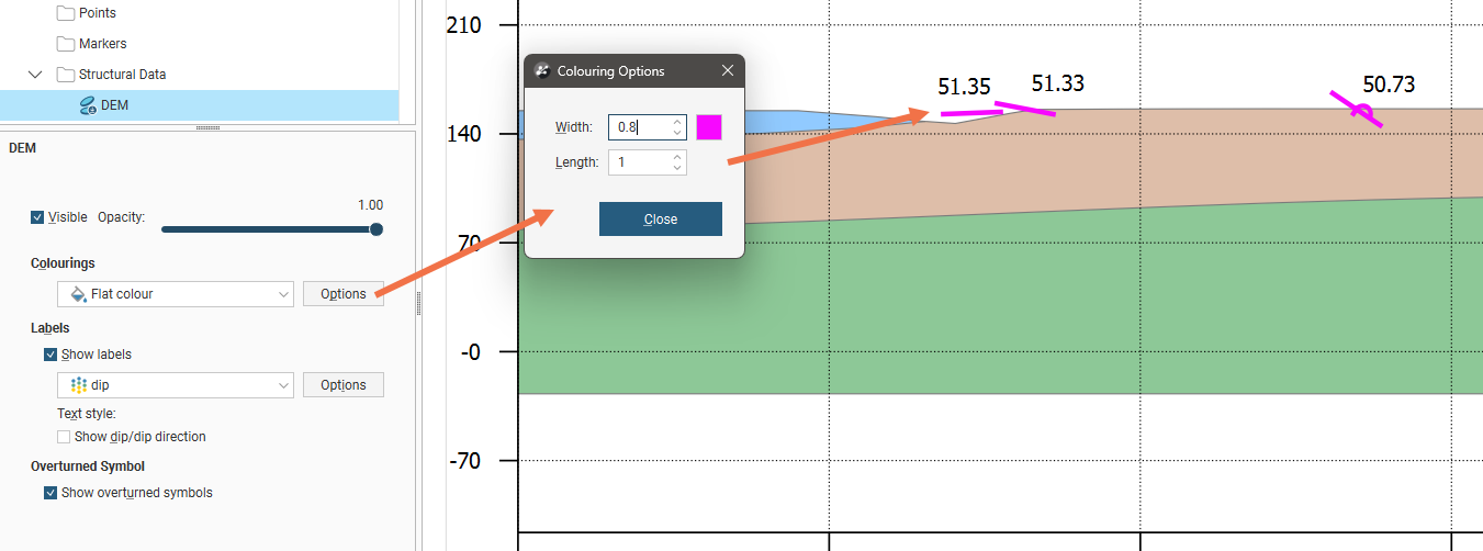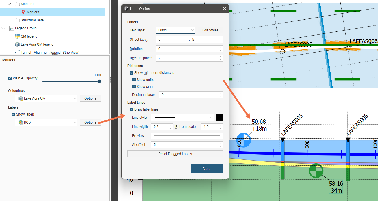 You can choose to Show labels or hide them. From the selector you can choose the same option as used for Colourings or a different option. Click the Options button to customise the labelling. Text style provides a list of available styles, or you can click Edit Styles to customise the style. Offset (x, y) positions the label a specified distance away from the marker it is referencing. Rotation will put an angle on the label, useful when labels are close together. You can choose whether or not to Show minimum distances for the marker from the section plane and you can also choose to Show units and specify the number of Decimal places to show.
