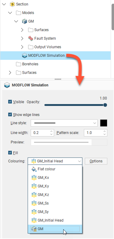 Flow models and block models appear in the Models folder as a single object. The Colouring option is used to display a flat colour or one of the model’s hydrological properties, with each of the hydrological categories available for the model being listed, or the geological model from which the model was gridded: