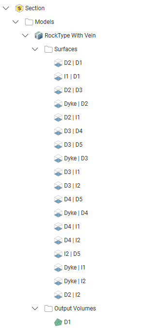 It can result in a large number of surfaces to work with, but does provide you more control over how these surfaces appear on the section layout. For example, here the outline of the purple I2 intrusion volume can be shown in different styles (as with the yellow D2 contact) or not at all (as with the grey Dyke contacts):