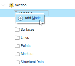 The folders below the Section object are used to add and organise models, boreholes, surfaces, lines, points and structural data and to customise how they are displayed: