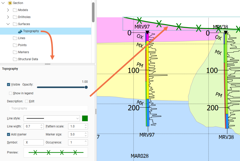 Visibility can be turned on or off and the Opacity of the projection of the surface onto the section can be set. Edit the text used to display the surface by enabling the Edit box and then changing the text. You can change the Line style, Line width, Pattern scale and colour. You can also define a marker to display along the line by enabling Add marker and then specifying a Symbol to use. Increasing the Occurrence number increases the gap between symbols. A Preview is displayed and the surface will be updated in the section preview.