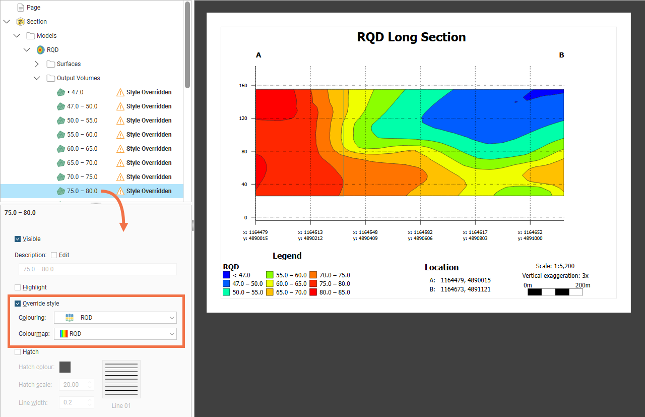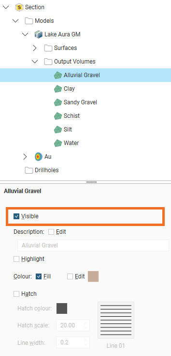 - For geological models, numeric models and combined models, expand the model in the layout tree to change how each output volume is displayed. You can hide volumes by deselecting the Visible setting, or tick Highlight to increase the weight of the some of the output volumes. You can use an automatically selected flat fill colour or set a specific flat fill colour. For numeric models, if you override the style of a volume, you can also use the colour associated with the data column and a selected colourmap. Hatching patterns and colours can be added and customised.