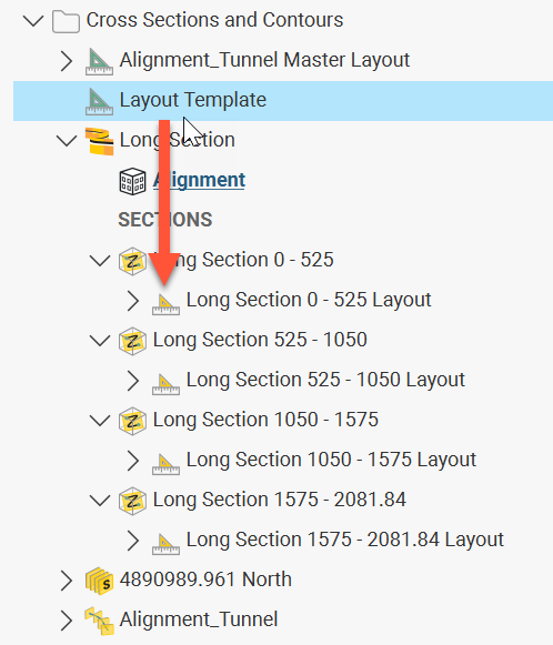 Provide a Name for the layout template and click the Save section layout icon () in the toolbar to preserve your changes. In the project tree, the layout template will appear under the Sections, Plans and Contours folder.