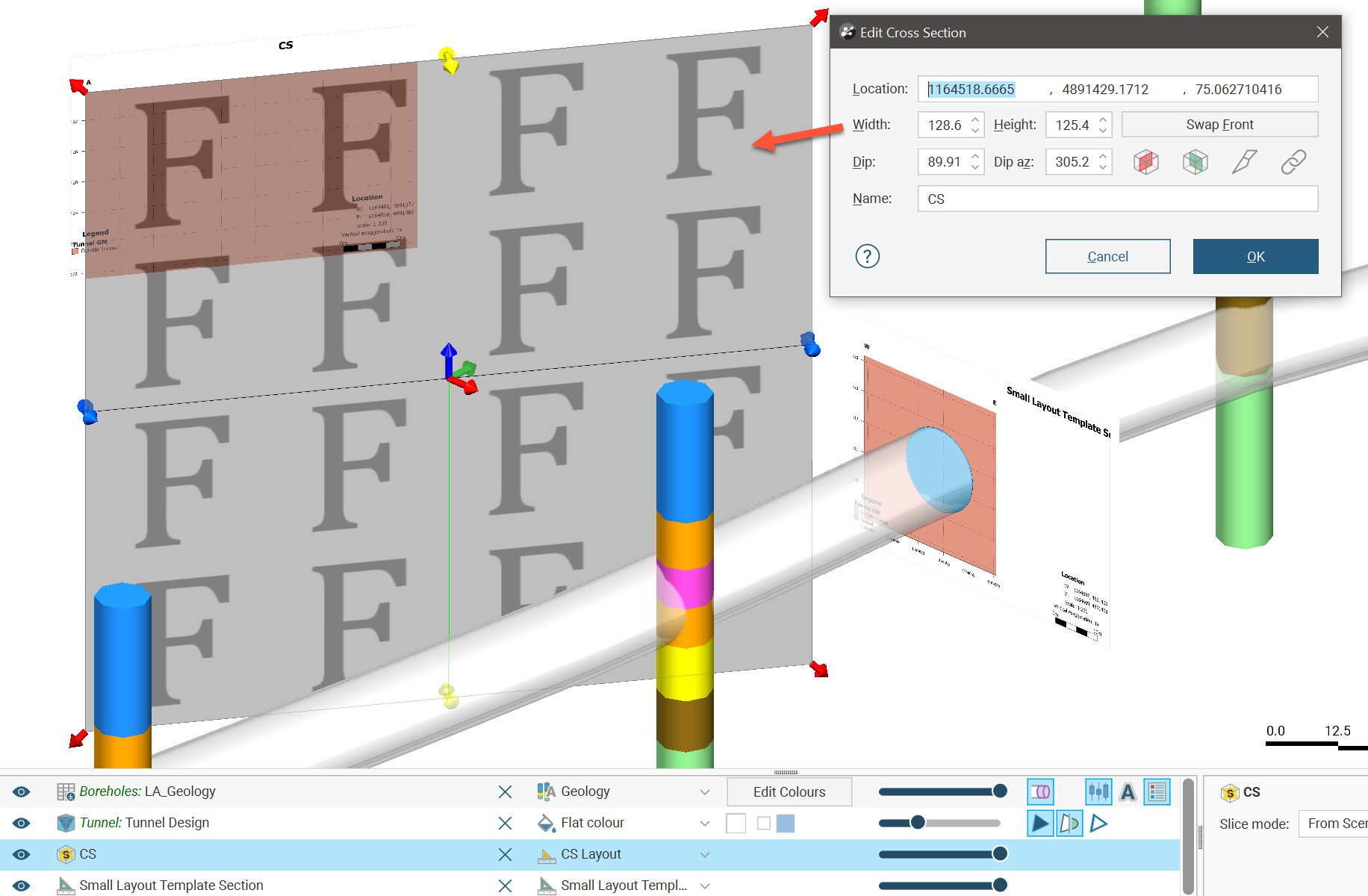 When creating a layout template, only the objects and settings common to all section types can be used. For example, if you want all your sections in a long section series to use orthogonal projection — a long section specific option — you will need to employ an alternate strategy. One strategy is to create a layout for one section in a series, then use Copy To to duplicate the layout for each of the adjacent sections. Changes made to the original section layout will not automatically update the sections the layout was copied to.