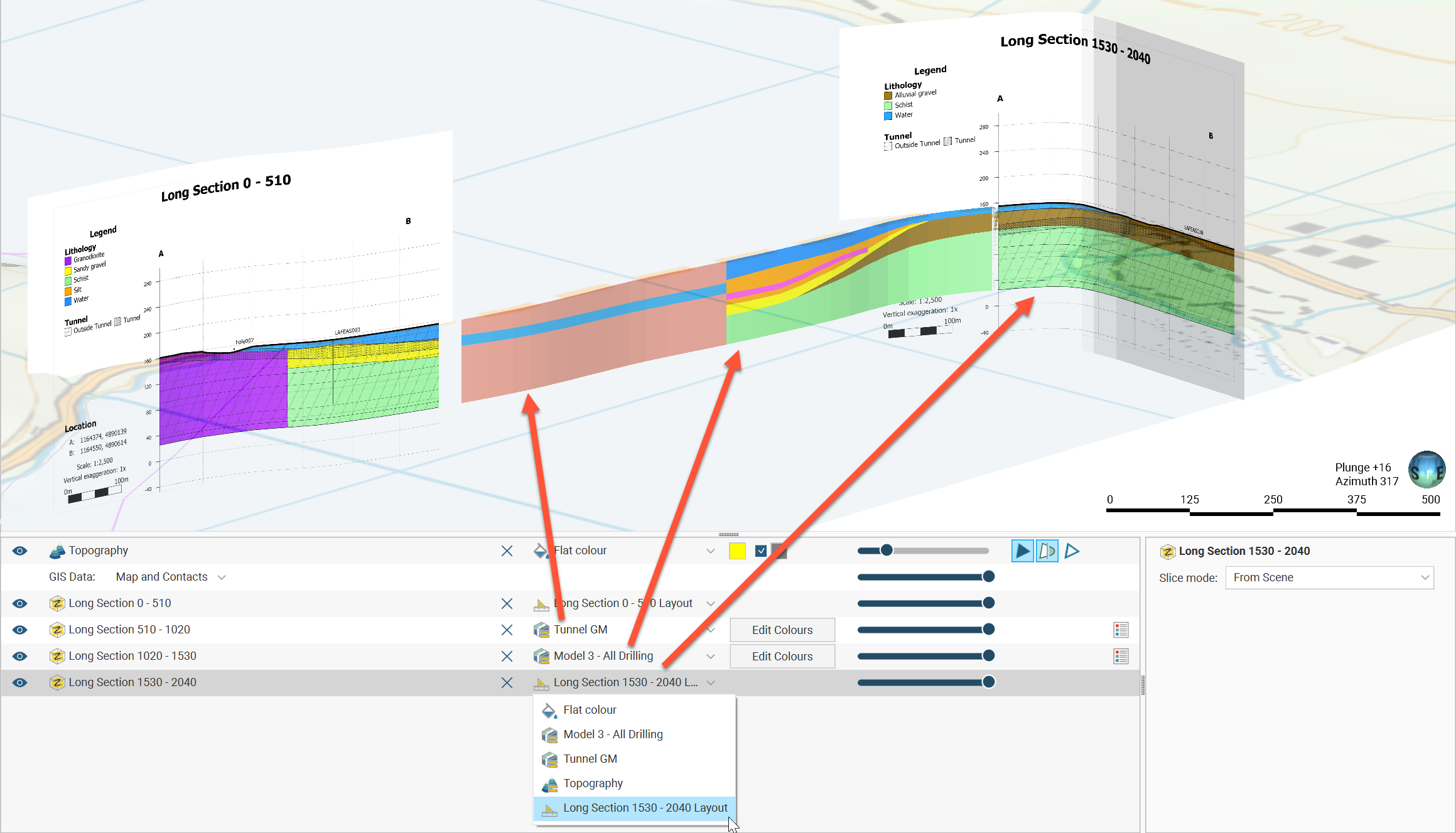 Adding the top-level long section object to the scene will display the section evaluation area, with the specific evaluation being selectable from the view list. This object cannot be displayed in the scene using the section layout.