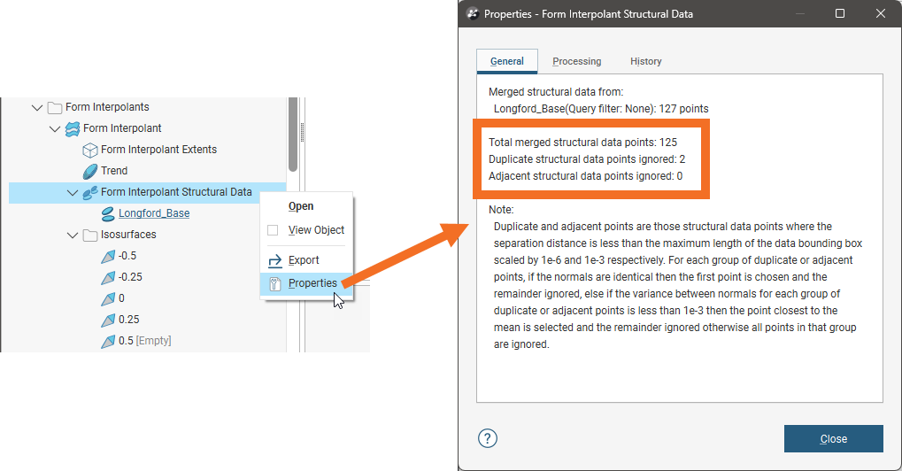 To view information about the data used for the form interpolant, right-click on the structural data object (
