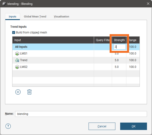Near the input data, the Strength and Range values will inform the structural trend. Where multiple inputs in the same range exist, the relative influence of each is determined by a weighted average of both the Strength and Range of each component trend input.