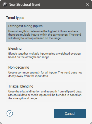 After selecting a structural trend type the New Structural Trend window for the selected trend type will open. Strongest along inputs, Non-decaying and Triaxial Blending have a window with two tabs, Blending has a slightly different window with three tabs.