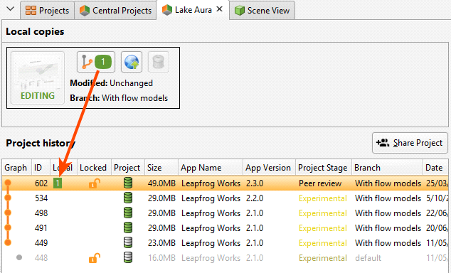 These are displayed visually in a project’s history tab, with local copies of projects shown in the panel at the top of the tab: