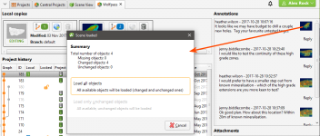 With Annotations, Central Browser and Leapfrog Works users can carry out conversations about specific aspects of the model. Annotations include a scene. If you already have the project open in Leapfrog Works, you can load any scene from that project’s history by clicking on it. Information about the selected scene will be displayed and you will be prompted to load all the objects or only the unchanged objects: