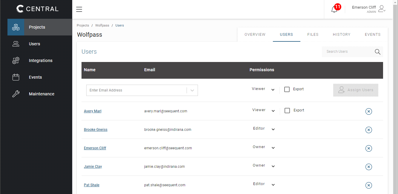 There are four levels of project permissions in Central: Owner, Editor, Viewer+Export and Viewer.