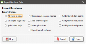 To export a single borehole data table, right-click on that table and select Export. The Export Borehole Data window will appear: