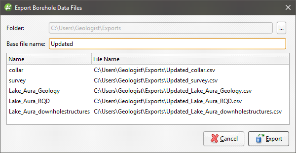 Once you have selected how you wish to export the data, click OK. The Export Borehole Data Files window will appear: