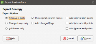 These export options export the borehole data tables using To and From values to indicate location information. If you wish to export data with X-Y-Z values, extract points data using one of the following options: