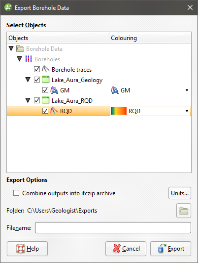 To export all borehole data, right-click on the Boreholes object and select Export. The Export Borehole Data window will appear:
