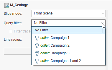 When a data table is selected in the shape list, you can use the controls in the shape properties panel to apply filters to the data in the scene. If query filters are available for the selected object, they will be listed in the Query filter list: