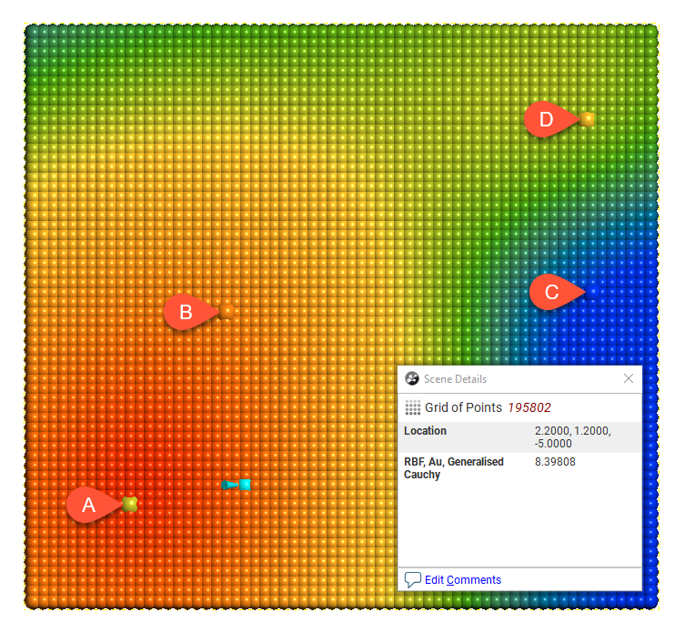 For each model type, the effect of the interpolation function is depicted by evaluation onto a grid of points, using as input just four samples, A = 7, B = 14, C = 2 and D = 8. A thin slice is taken through the grid of points to provide a sort of 2D visualisation of the operation of the function. One of the points has been selected in each view to display the value being estimated for a specific location.