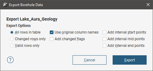 To export a single borehole data table, right-click on that table and select Export. The Export Borehole Data window will appear: