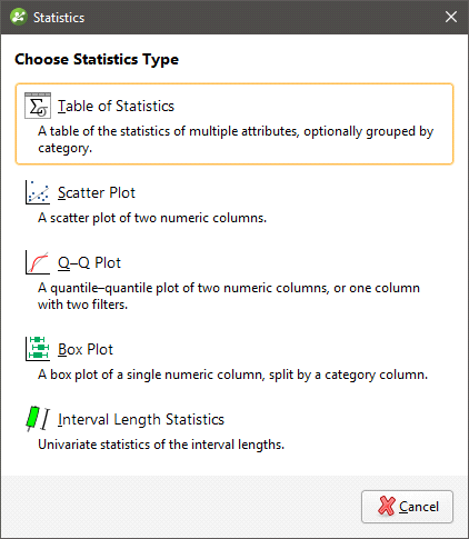Once you have created a composited table, you can view statistics on the table. To do this, right-click on it and select Statistics. The following options are available: