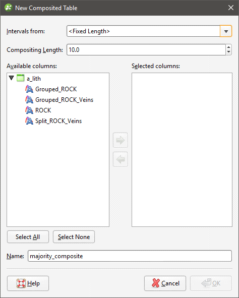 Borehole data is composited from the Composites folder, which is in the project tree as part of the Boreholes object. To create a majority composite, right-click on the Composites folder and select New Majority Composite. The New Composited Table window will appear: