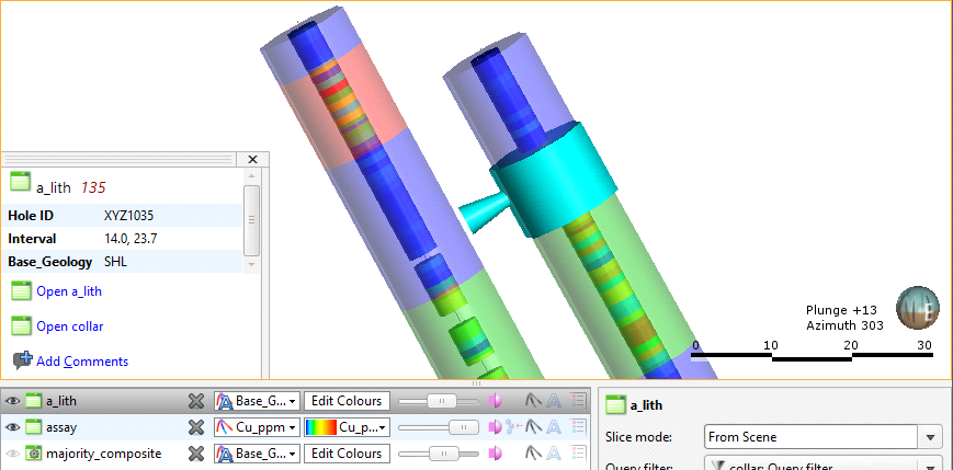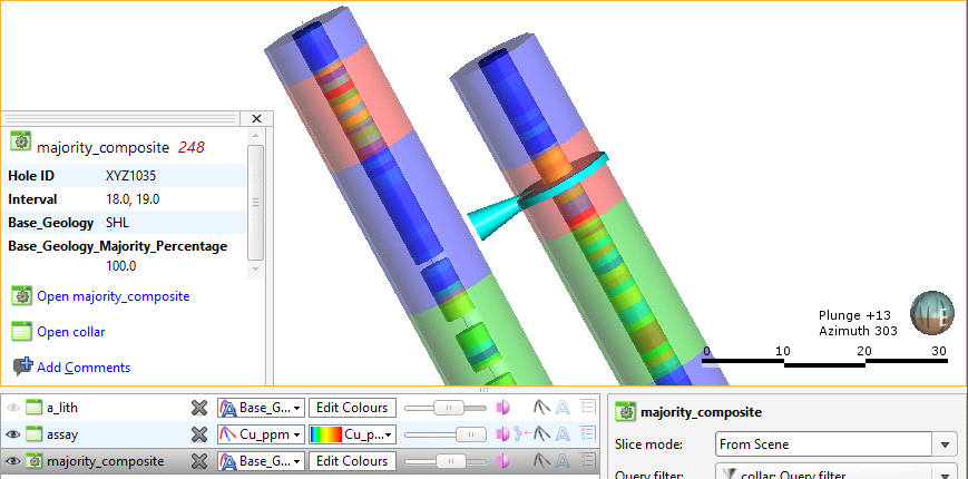 Here a majority composite has been created based on the lithology table using the assay table intervals. The category column displayed in the scene appears similar to the category column used to create it, but selecting an interval in the scene shows that the lithology has been composited into smaller intervals that match the assay intervals:
