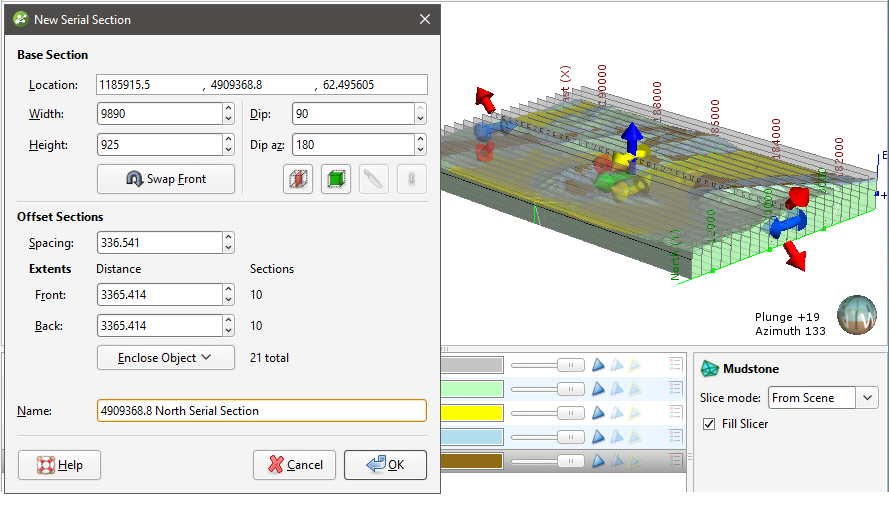 To create a serial section, add a model to the scene. Next, right-click on the Cross Sections and Contours folder and select New Serial Section. The New Serial Section window will appear and planes representing the base section and the offset sections will be added to the scene: